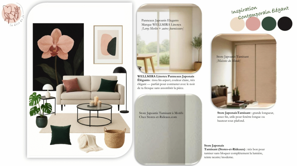 Fresque murale noire à motif floral : pièce maîtresse de la décoration, apportant un côté artistique et théâtral. Canapé beige clair, base neutre et intemporelle, qui laisse place aux accessoires pour rythmer l’espace. Coussins vert foncé et vieux rose, touches colorées qui rappellent la fresque et dynamisent la déco. La table basse ronde de couleur noire, structure légère rappel graphique du noir de la fresque. Accessoires naturels, panier tressé, plaid clair et tapis beige pour réchauffer l’ambiance. Les plantes vertes ajoutent de la fraicheur et du naturel. Les stores Japonais font un parfait équilibre avec le noir de la fresque sans assombrir. Idéal pour fenêtre large ou hauteur sous plafond.