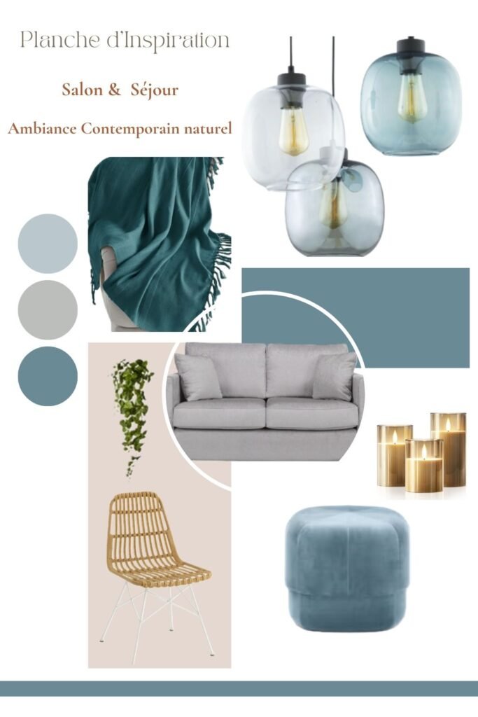 Cette planche d’inspiration traduit une ambiance douce et épurée, issue d’un style contemporain mêlé à des touches scandinaves naturelles. Le choix des matériaux, des formes et des couleurs contribue à créer un intérieur apaisant, lumineux et intemporel.