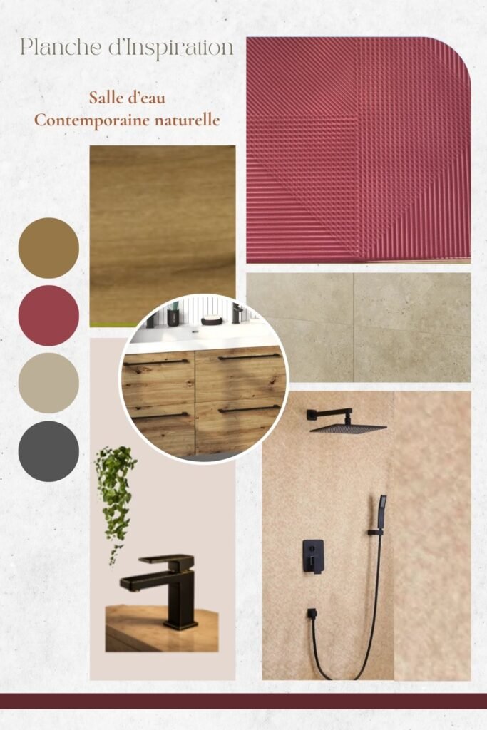 À travers cette planche d’inspiration, j’ai imaginé une salle d’eau contemporaine naturelle, où les matériaux rencontrent des éléments plus graphiques. L’objectif : créer un équilibre entre douceur, modernité et caractère.
